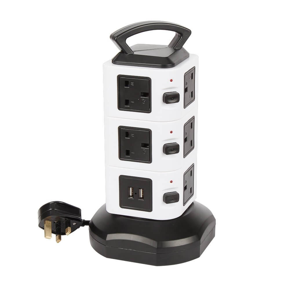- 1* 12 way + 2USB UK Plug Extension Lead (Black+White)