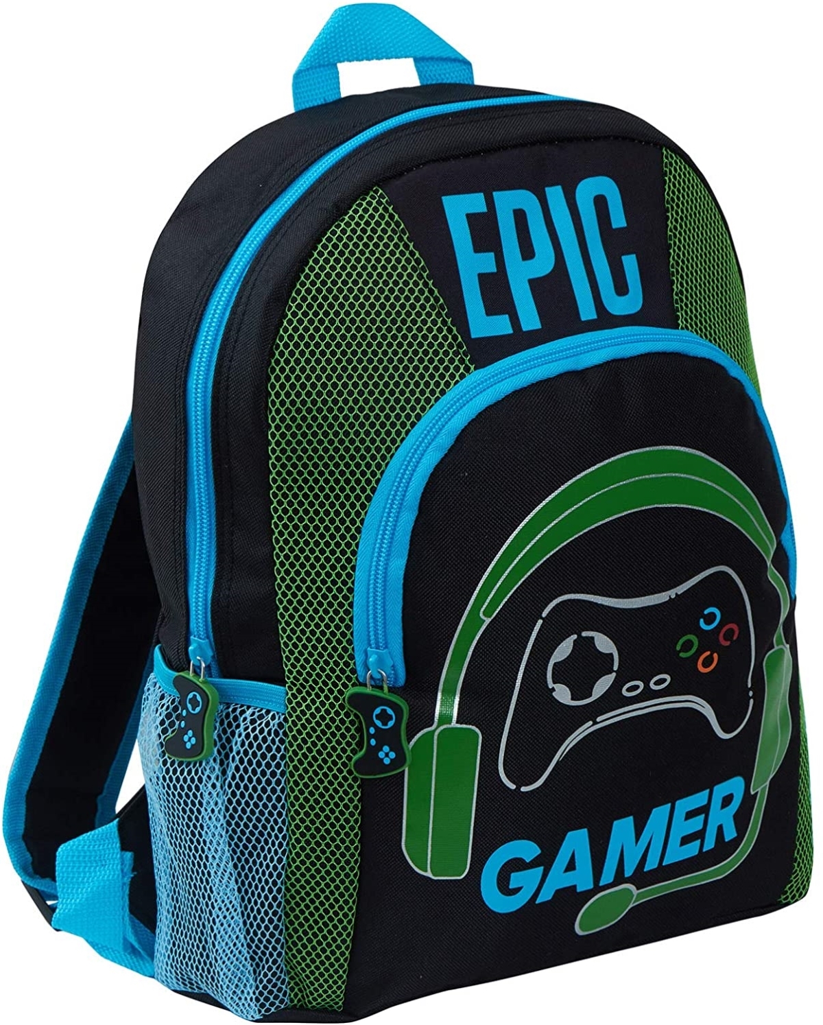 - UNIQUE: These bags are an exclusive design and can only be found in our store. Colour is key – using the 2 main gaming branded colours – blue and green to suit both gaming console fans. We have all gamers number one tools – the headset + microphone and controller that are highlighted in metallic silver for a 3d effect. Using the popular gaming term Epic in this popular phrase and slogan “Epic Gamer” and as an added detail the bag has controller shaped zip pulls.