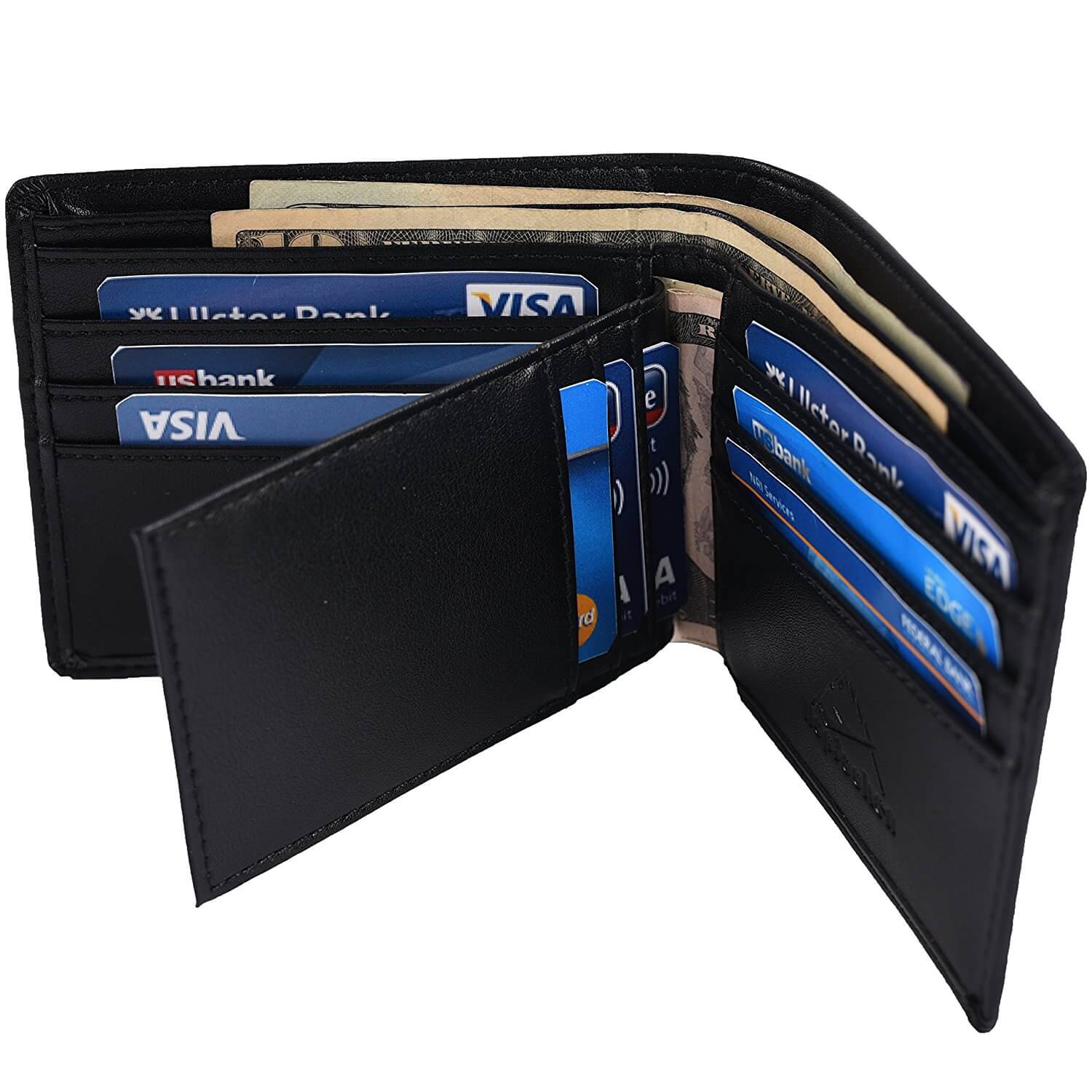- 14 pockets including 9 standard card slots; 1 ID window, 2 pockets for coins and 2 pockets for notes. Easily holds credit cards, ID card and cash.