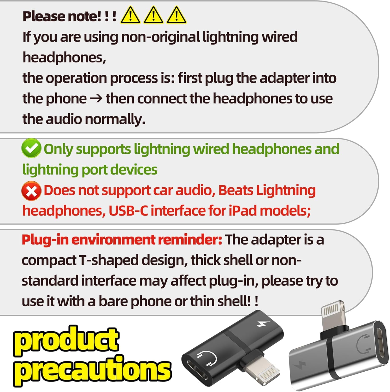 - Note!! – The Lightning Splitter does not support dual earphones/dual charging cables plugged in at the same time. If you are using non-original Lightning wired earphones, you need to plug the adapter into the phone first, and then connect the earphones to use them normally!!