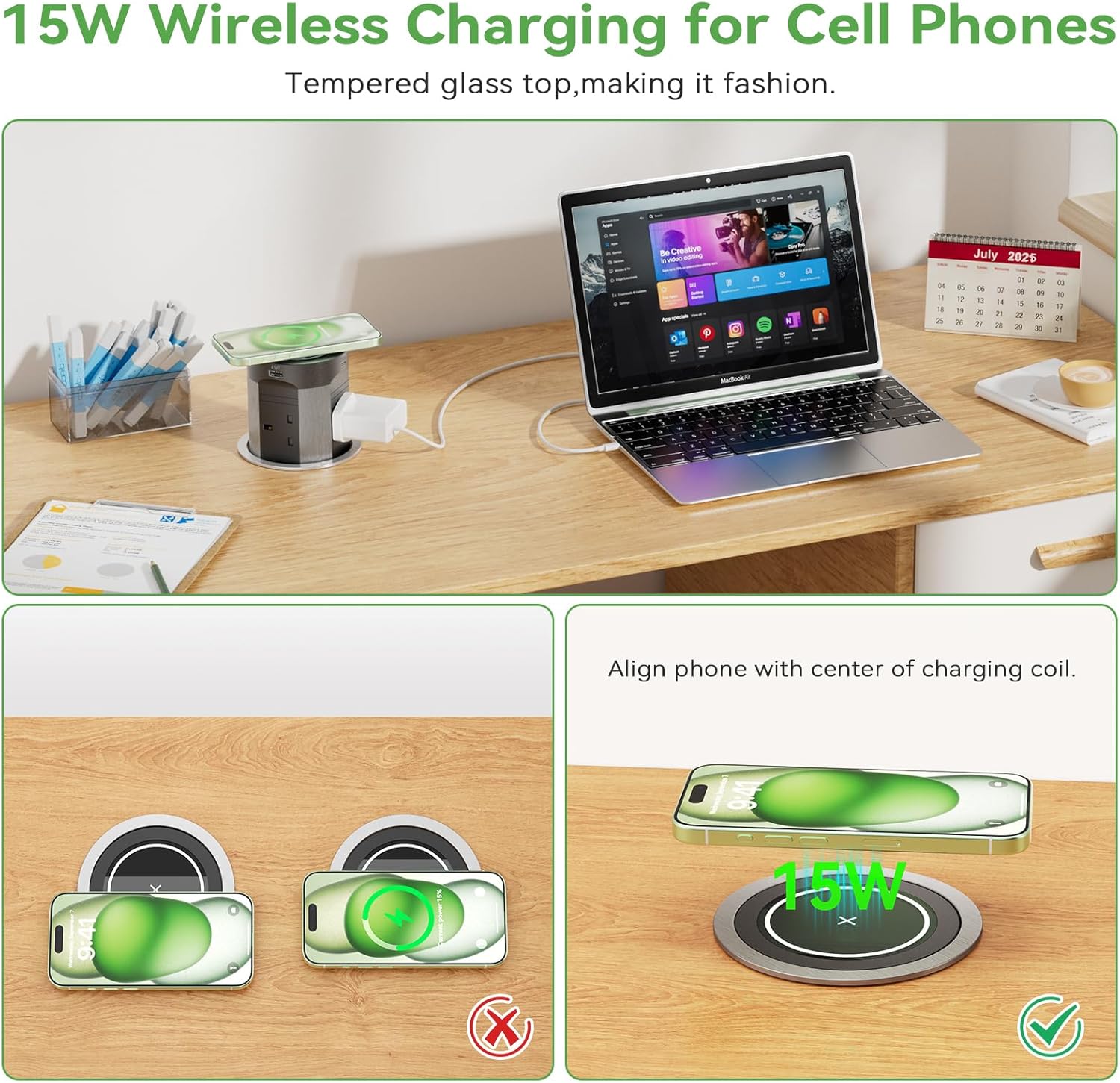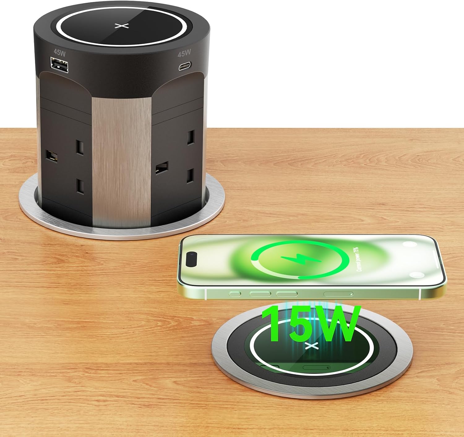• 15W Wireless Charging: The top of the pop up socket is equipped with a 15W wireless charging pad made of glass, offering a stylish and elegant design. Universally compatible with all Q i-enabled devices, fully automatic retractable design, when the power outlet is in flush status, you can also use the 15W wireless panel to charge your phone. Get rid of messy cables.